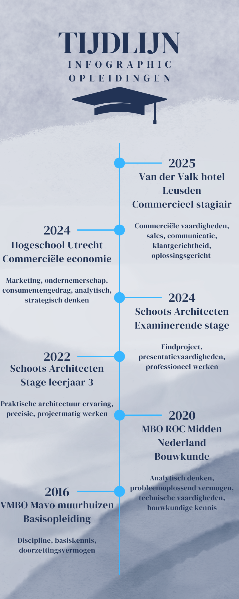 Hieronder zie je mijn opleidingen, stages en werkervaring. Ze laten zien hoe ik groei, welke uitdagingen ik aanga en wat ik kan bijdragen aan een organisatie of team.